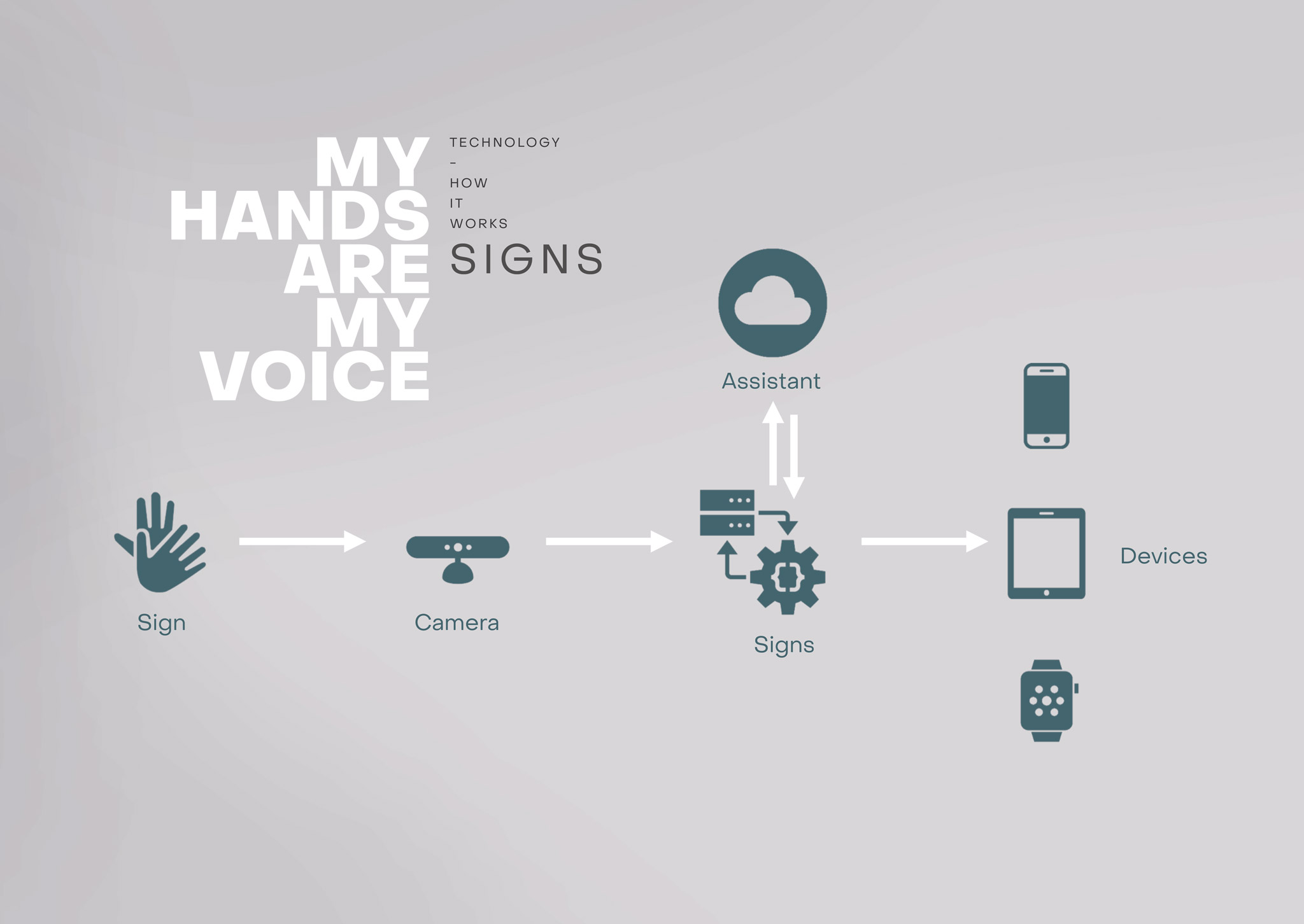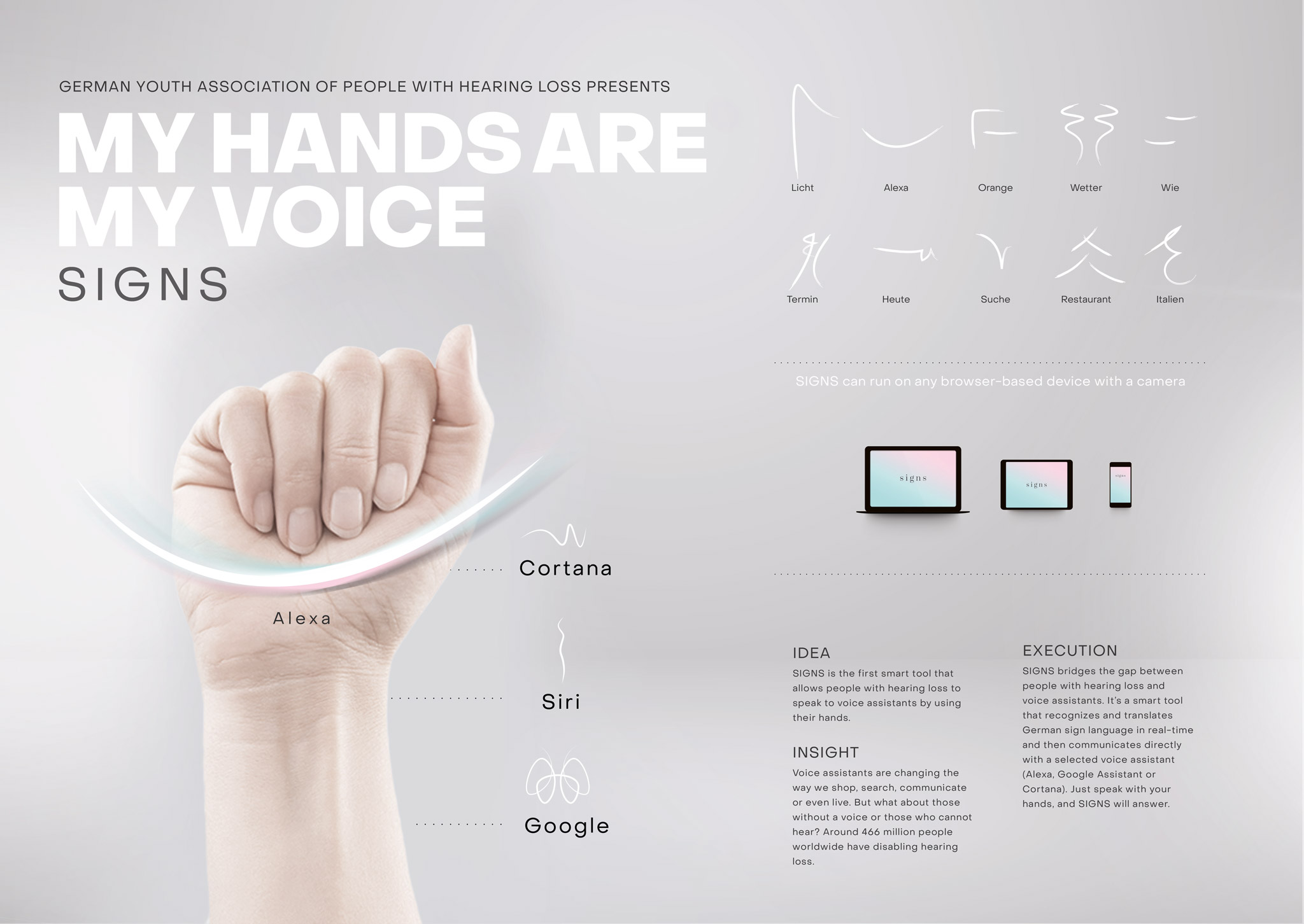 There are over 2 billion voice-enabled devices across the globe. Voice assistants are changing the way we shop, search, communicate or even live. At least for most people. But what about those without a voice? What about those who cannot hear? According to the World Health Organization around 466 million people worldwide have disabling hearing loss. Project SIGNS was developed to create awareness for inclusion in the digital age as well as to facilitate access to new technologies.