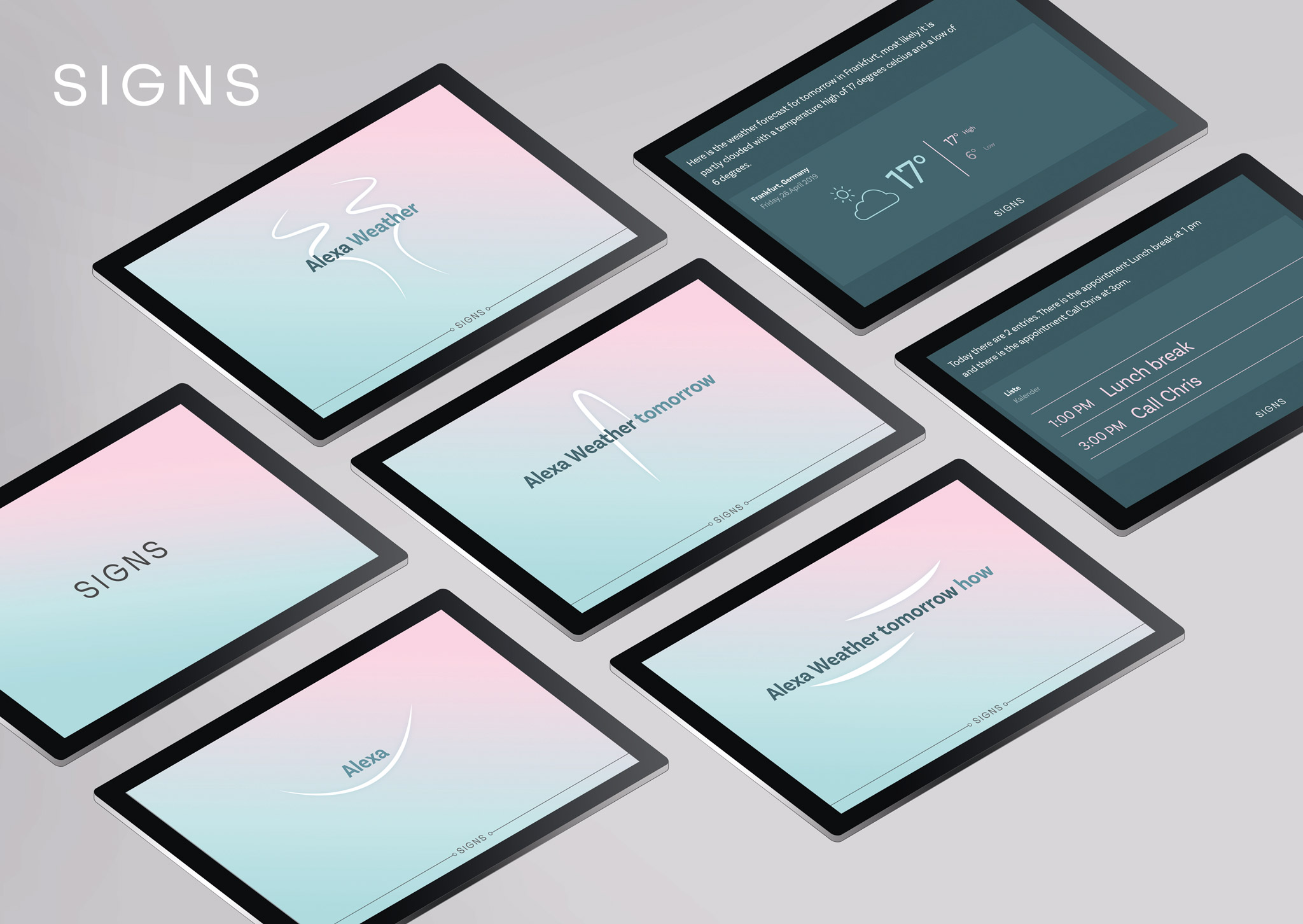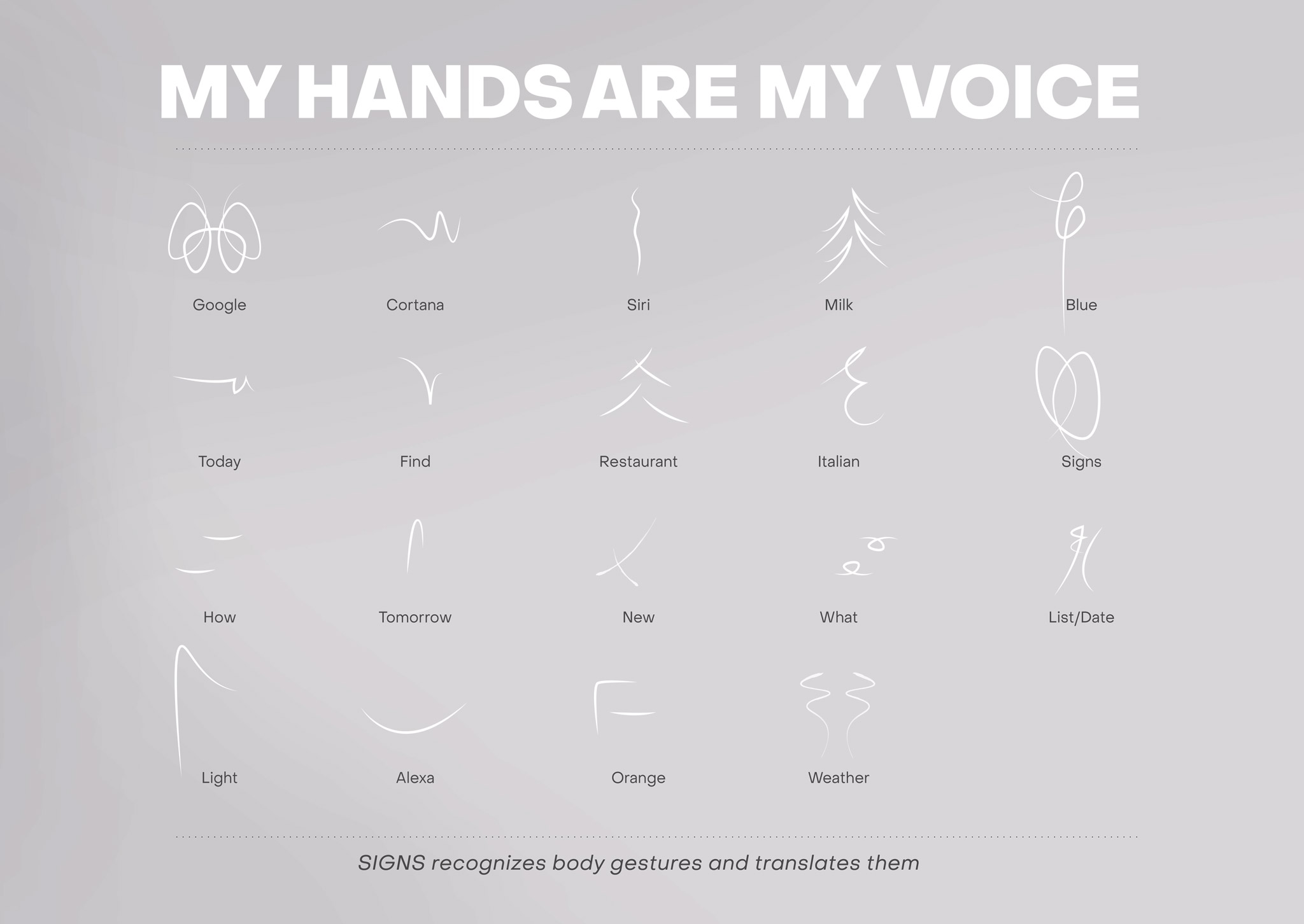 SIGNS was pre-trained with video footage of people whouse sign language. SIGNS includes a training interface that can be used toteach new gestures in real time. SIGNS then recognizes these gestures and acts as aninterface to voice assistant systems such as Amazon Alexa, Google Home orMicrosoft Cortana. SIGNSis based on an intelligent machine learning framework that is trained toidentify body gestures with the help of an integrated camera. These gesturesare converted into a data format that the voice assistant service understands. Thevoice assistant processes the data in real-time and replies appropriately.SIGNS replaces voice assistants’ typical form of communication through audiosignals with a visuality – but not only by displaying the word. The visualinterface of SIGNS fulfills various requirements that are necessary for anintuitive experience. SIGNS follows the basic principles of sign language.Therefore, the SIGNS dictionary was developed – a set of symbols that areinspired by the hand movements. Just like with other voice assistant devicesthe user has to naturally interact with the device.